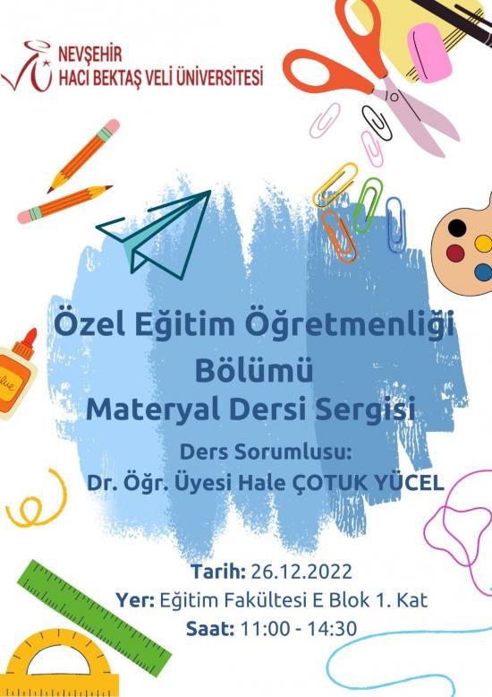 Özel Eğitim Bölümü öğrencileri tarafından Dr. Öğrt. Üyesi Hale ÇOTUK YÜCEL sorumluluğundaki “Özel Eğitimde Materyal Tasarımı” dersi kapsamında hazırlanan materyaller 26 Aralık 2022 Pazartesi günü saat 11.00’de Eğitim Fakültesi E Blok 1. Katta sergilenecektir.