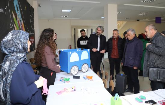 Akademik danışmanlığını Doç. Dr. Vedat Aktepe’nin yaptığı sergide, Sınıf Öğretmenliği Bölümü öğrencilerinin farklı ders alanlarına yönelik olarak hazırladığı çok sayıda özgün öğretim materyali yer aldı. Sergide Türkçe dersi için kelime bilgisi ve kavram öğretimini destekleyen “Zıt Apartmandaki Kirazlar” ile “Sözcüklerde Benzerlik ve Karşıtlık”; Matematik dersine yönelik olarak günlük yaşamla ilişkilendirilen “Her Yerde Geometri”, “Mantarlı İşlem Çarkı Tahtası” ve “Saatim Kaç?” materyalleri dikkat çekti.