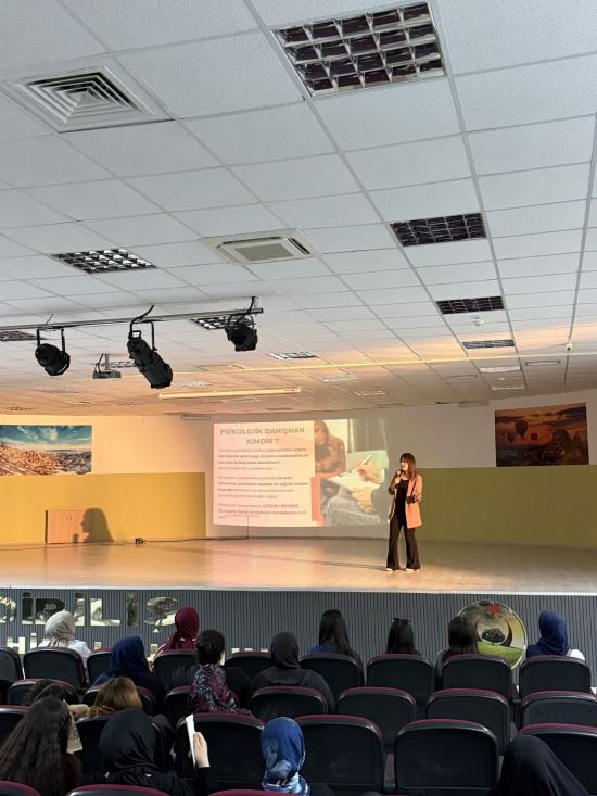 Fakültemiz Eğitim Bilimleri Bölümü öğretim elemanı Arş. Gör. Ayşenaz Ekin Duman, Nevşehir Diriliş Kız Anadolu İmam Hatip Lisesi tarafından düzenlenen "Kariyer ve Meslek Tanıtım Günleri" kapsamında seminer verdi. 27.03.2026 tarihinde gerçekleştirilen seminerde, sınava hazırlanan öğrencilere Rehberlik ve Psikolojik Danışmanlık Bölümü ve Psikolojik Danışmanlık mesleği hakkında bilgilendirmelerde bulunuldu. Öğrencilerle etkileşim halinde ilerleyen seminerde, psikolojik danışmanların görev ve sorumlulukları, üniversite eğitimi, bölümde yer alan temel dersler, psikolojik danışmanların sahip olması beklenen özellikler, mezuniyet sonrası çalışma alanları, istihdam oranları ve psikoloji-pdr bölümlerinin farklarına değinildi. Seminer, öğrencilerin sorularının cevaplandırılmasıyla sona erdi.